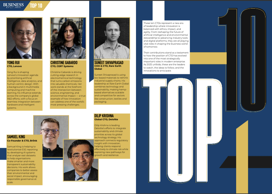 Now, in a year when global investment in AI innovation continues to grow at extraordinary pace, Rare Earth Global has also been named in Business Enquirer’s top 10 CTO and innovation team list. The recognition places the company in exceptional company and reinforces the significance of what a focused, purpose-driven startup can achieve when innovation is linked to real-world environmental and commercial outcomes.